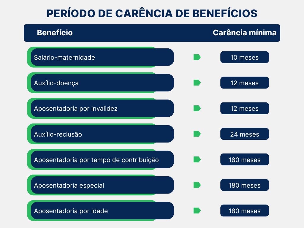 Além disso, o advogado deve conferir se as contribuições realizadas correspondem à carência mínima exigida pelo órgão. Cada benefício possui seu próprio período de carência. O tempo mínimo é de dez meses, e o máximo, de 180 meses. Confira a tabela:
